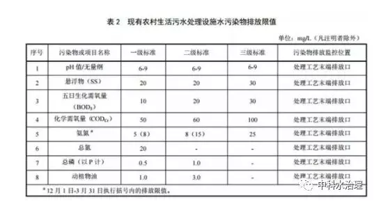 自 2021 年 1 月 1 日起,現(xiàn)有農(nóng)村生活污水處理設(shè)施按污水排放去向執(zhí)行表 2 規(guī)定的排放濃度限值。